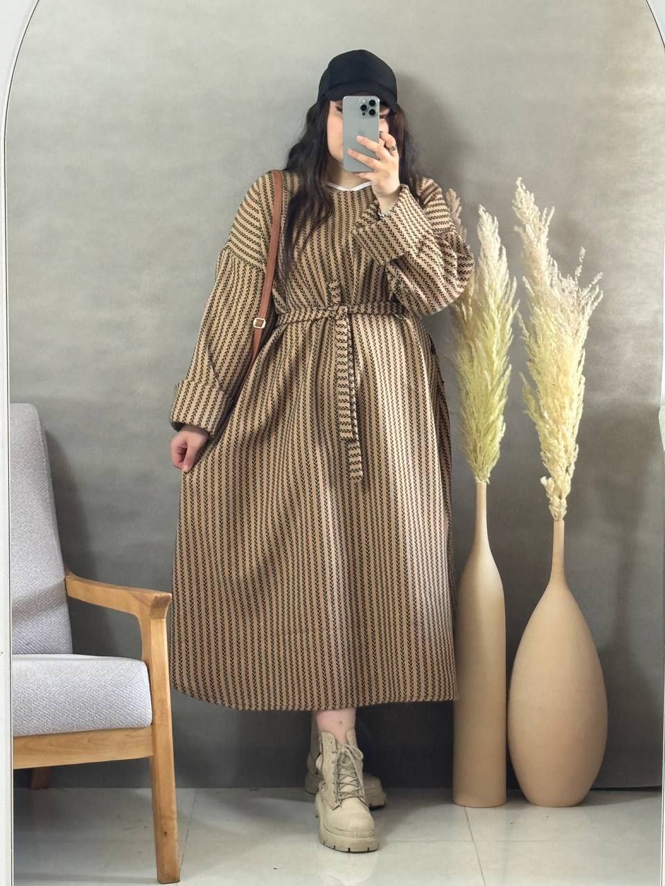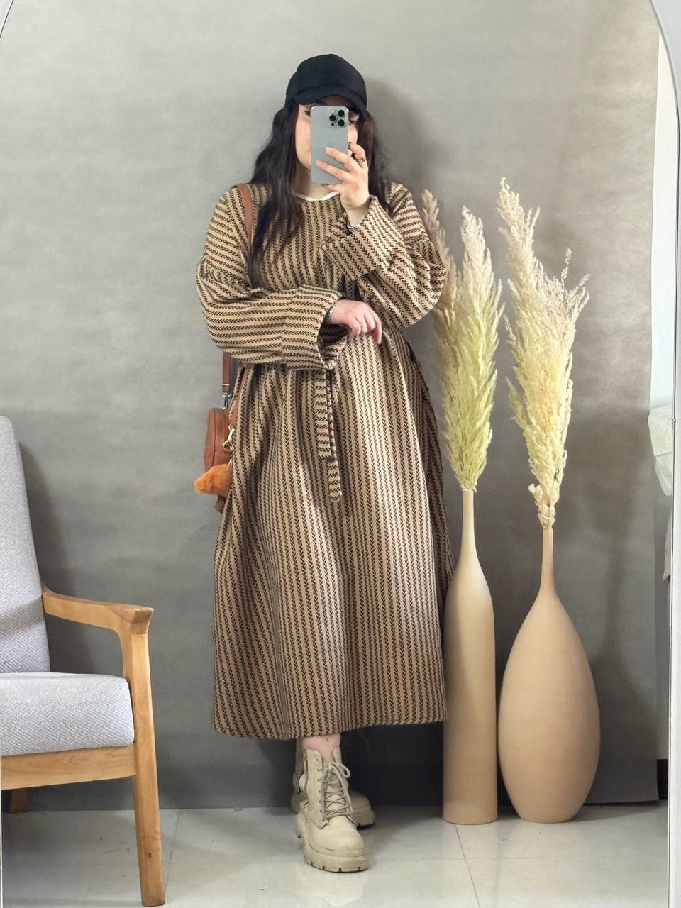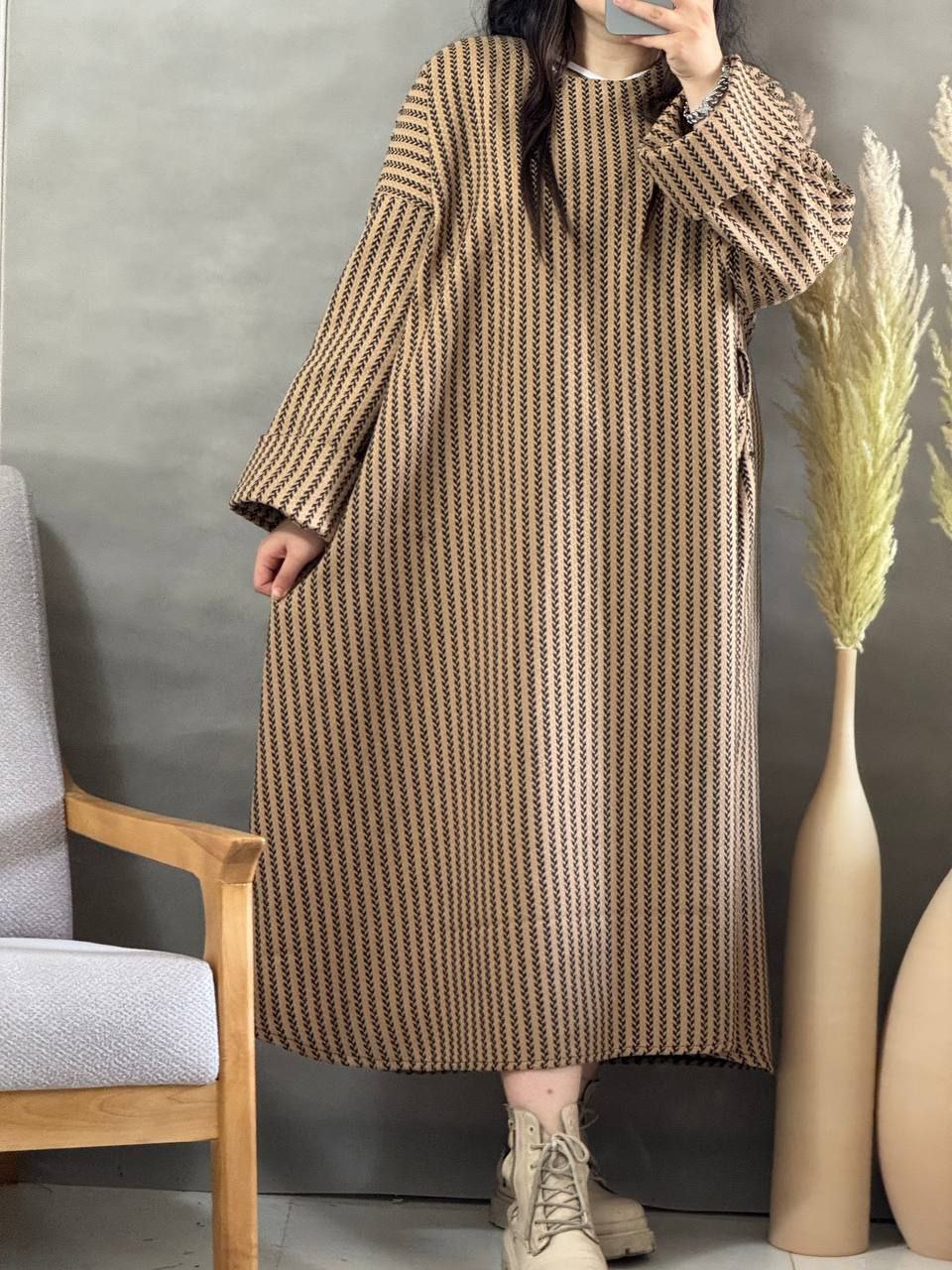 طرح گندمی ترند فری سایز از سایز ۳۸تا۵۰_قدکل ۱۲۵_دورسینه ازاد_قداستین ۵۵_کیفیت پارچه عالی همراه کمربند استین پاکتی
