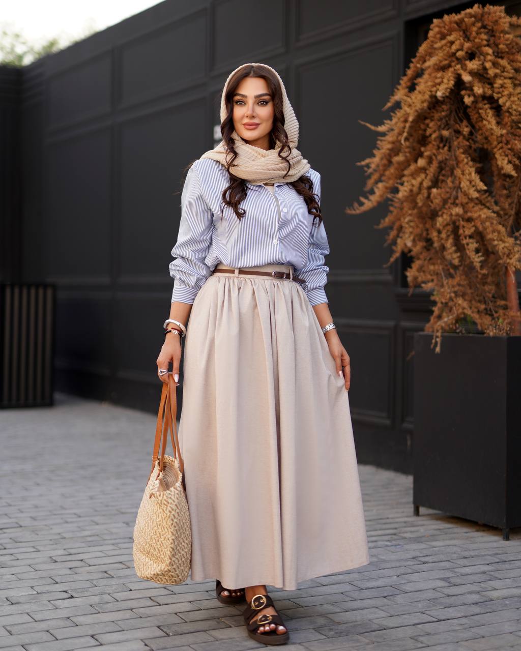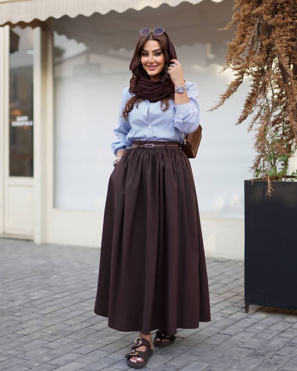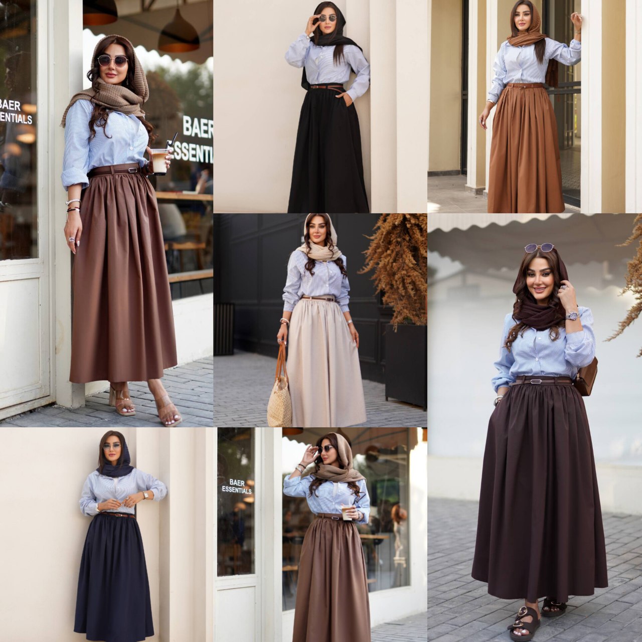 این دامن فول چین جیب دار میباشد برای چین زیاد از دو قد پارچه استفاده شده روی کار کمربند ست شده پشت کمر کش خورده