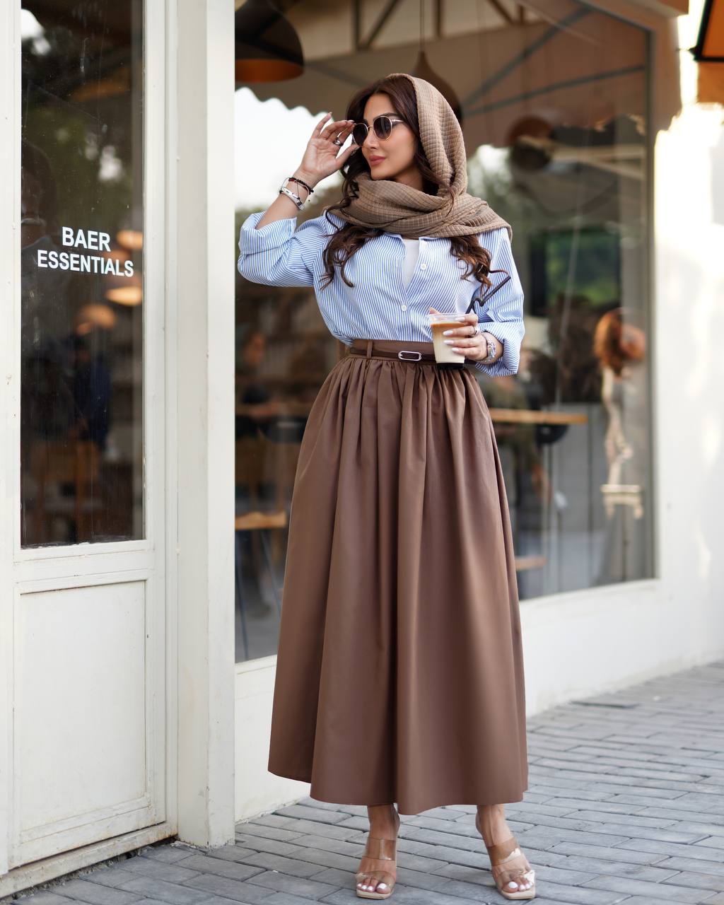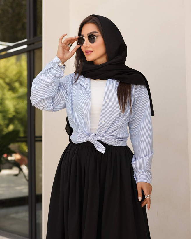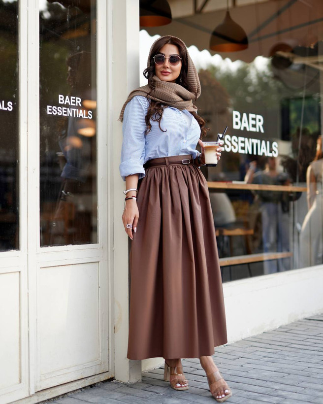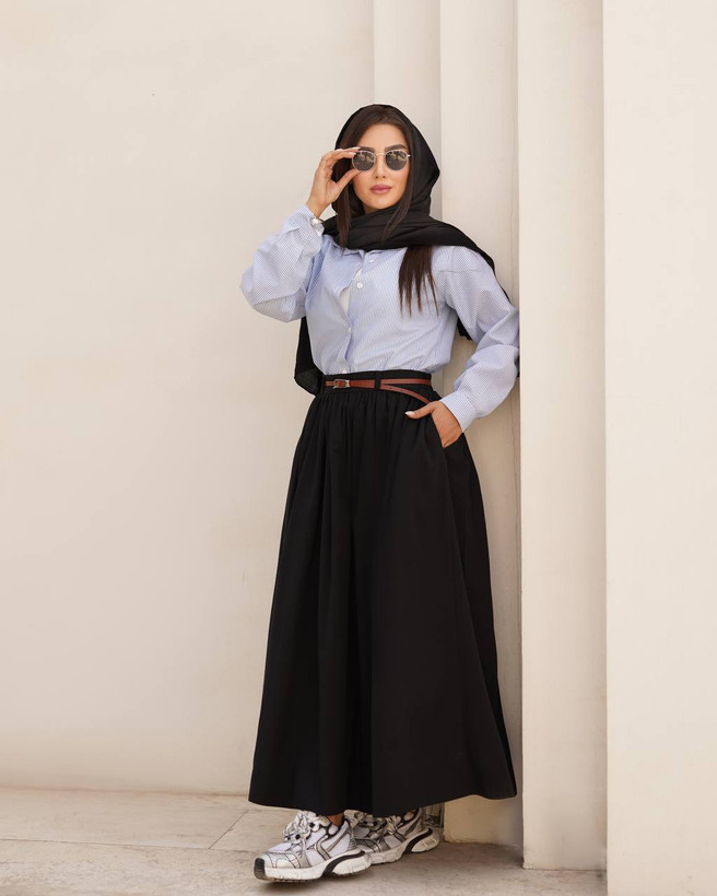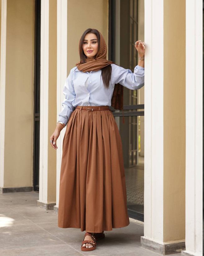 این دامن فول چین جیب دار میباشد برای چین زیاد از دو قد پارچه استفاده شده روی کار کمربند ست شده پشت کمر کش خورده