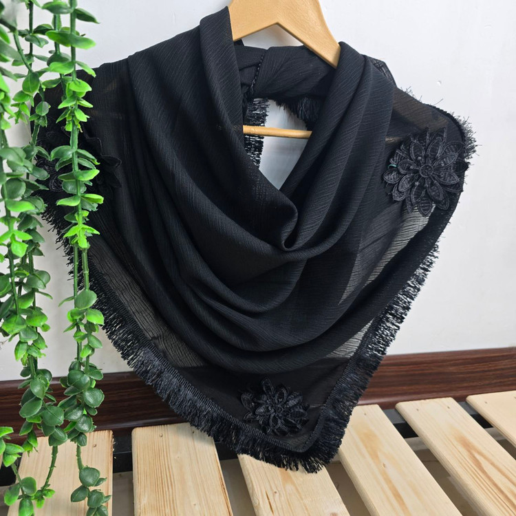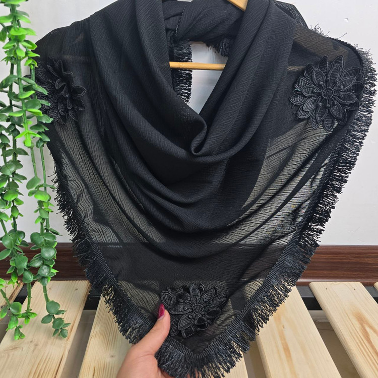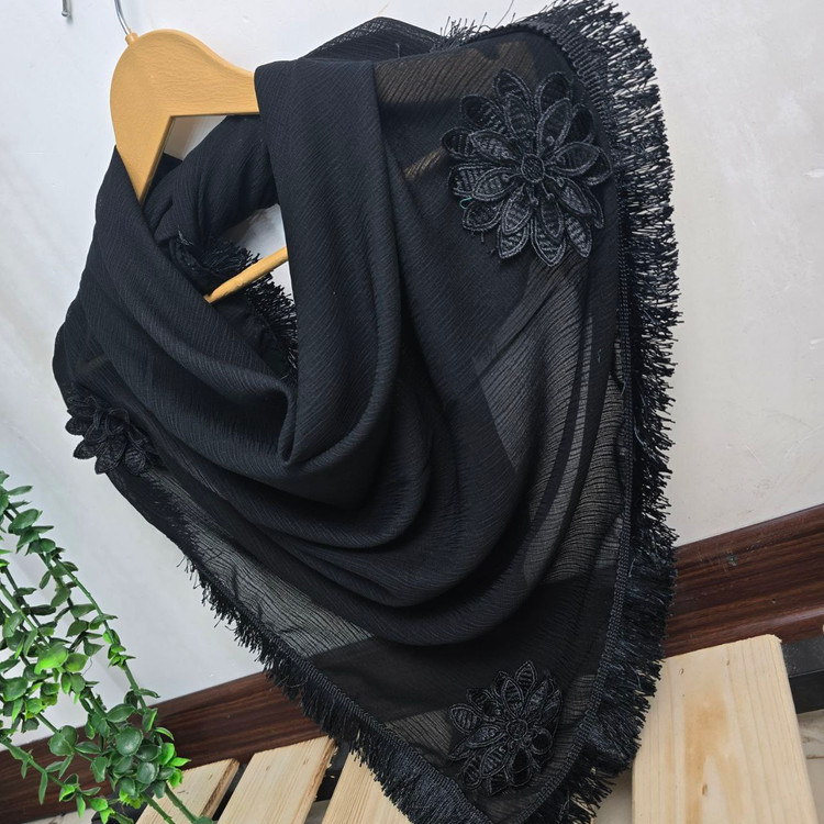 اگر ی روسری شیک مزونی واسه محرم میخوای این کار یکی از انتخاباتته جنس ژورژت درختی عالیه دور کار ریسه ابریشم دوخته شده سه تا گل دانتل برجسته و خوشگل داره