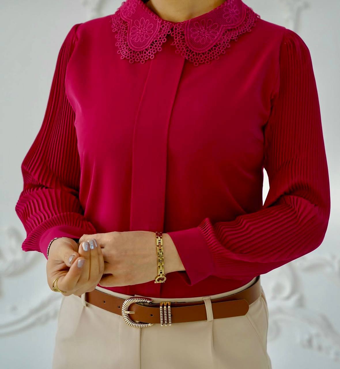 شومیز مزون دوز الیزه از جنس الیزه مصری گرم بالا آستین پلیسه زیر آستین لایی کارشده برای ایستادگی و دارای رنگ بندی هست